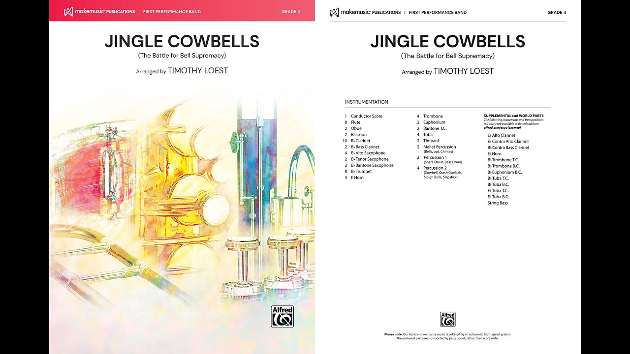 Sleigh bells face off with cowbell in Jingle Cowbells, a delightfully clever arrangement by Timothy Loest. The work is based on "Jingle Bells," "Old MacDonald Had a Farm," "Ukrainian Bell Carol," and other traditional favorites. Juxtapose both instruments front and center for a bell-centric experience that will be the talk of the town 'til the cows come home! (2:00)